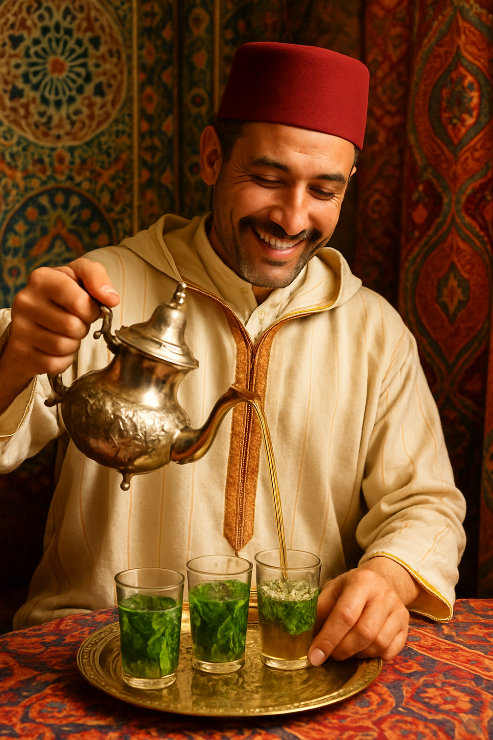 Color traditional clothing (caftans, djellabas, babouches), handcrafted items (teapots, lanterns, Berber jewelry), stunning palaces, and even delicious dishes like couscous and bastilla!